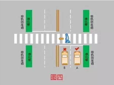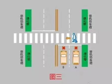 圖三:行人越過機動車道、非機動車道分隔線,進入上述位置,機動車A、B未停車讓行的,屬于違法行為。