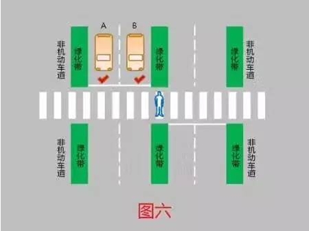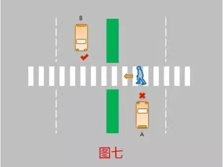 圖六:道路中央采用綠化帶隔離,行人在道路中央駐足區(qū)等待的,機動車A、B應(yīng)當減速行駛,可在確保安全的前提下通過人行橫道。