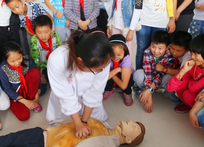 ?? “護(hù)士姐姐,我這樣按壓對不對”、“護(hù)士姐姐,我這力氣夠大了嗎”……5月22日,市區(qū)新華小學(xué)五樓的技能實驗室里好不熱鬧,衢州市人民醫(yī)院急診科的三名醫(yī)護(hù)人員,利用休息時間為四十余名五年級的學(xué)生講解急救知識,并示范心肺復(fù)蘇的正確方法。