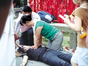 “雖然脈搏沒恢復(fù),可我們已經(jīng)感覺到病人已有微弱的呼吸了,說明是有希望的。后來又有懂得心肺復(fù)蘇救護技術(shù)的一男一女兩名醫(yī)務(wù)人員加入搶救隊伍,我們4人輪流施救?!绷中【暾f,來自天南地北的游客也不斷地送水、換毛巾、扇風(fēng)、鋪墊子,配合搶救工作。