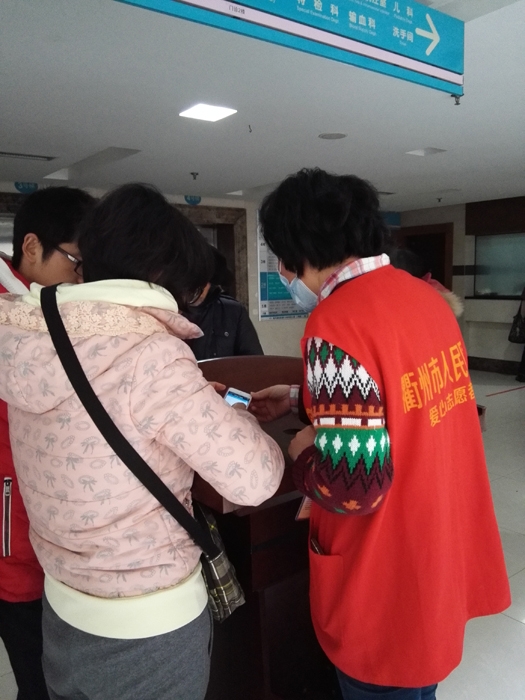 ??? 洪波、王建中、王金妹、王宇寧、胡曉芬、楊君梅、張俊晴、任紅、孫平平、章建霞、周華、周妮、金菊仙、杜長寶、傅亞靈、陸佳佳、葉麗婷等17人在衢州市人民醫(yī)院做志愿者,主要來自社會志愿者和本院志愿者。 志愿者們主要為患者指路引導(dǎo),陪伴行動不便、年老體弱患者就診,指導(dǎo)患者自助服務(wù)機使用方法,引導(dǎo)患者化驗前取號、打印化驗單,協(xié)助門診大廳工作人員疏導(dǎo)病人。