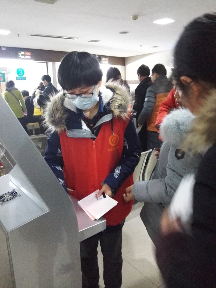??? ?徐鑫洋、湯美娟、湯玉卿、陳夏雯、徐嘉妮、葉佳怡、周育存、汪潔瓊、李興江、余照坤、徐家梅、彭紫媛、陳安琪等13人在衢州市人民醫(yī)院做志愿者,主要來自寒假學生志愿者。 志愿者們主要為患者指路引導(dǎo),陪伴行動不便、年老體弱患者就診,指導(dǎo)患者自助服務(wù)機使用方法,引導(dǎo)患者化驗前取號、打印化驗單,協(xié)助門診大廳工作人員疏導(dǎo)病人。