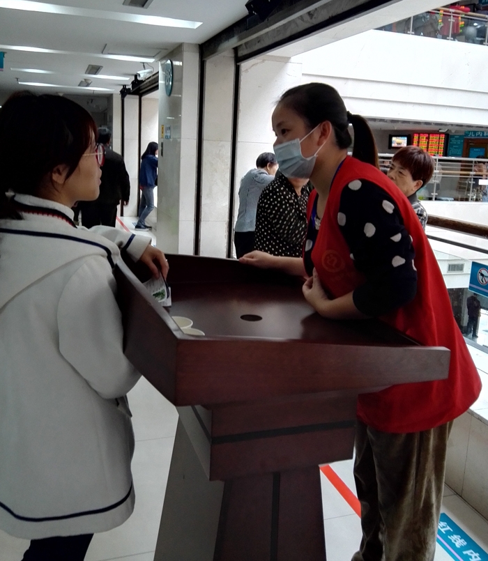 ??? 許建偉、王霞、宋祝敏美、季芳菲、程琳、張波、徐麗瓊、趙凌斐、鄭迎霞、黃燕、徐靜等11人在衢州市人民醫(yī)院做志愿者。志愿者們主要在門診大廳一樓至五樓接受患者咨詢、引導(dǎo)自助服務(wù)機使用方法、流動服務(wù)、幫助身體虛弱及身心障礙者等提供引導(dǎo)、協(xié)助門診大廳工作人員疏導(dǎo)病人。