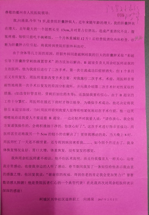 感謝信(致肝膽外科周余旺醫(yī)師)
