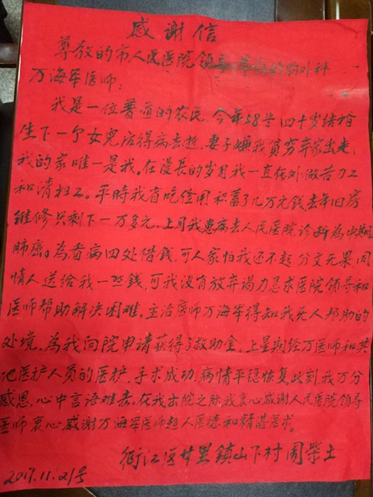 感謝信(致心胸外科萬海軍醫(yī)師)