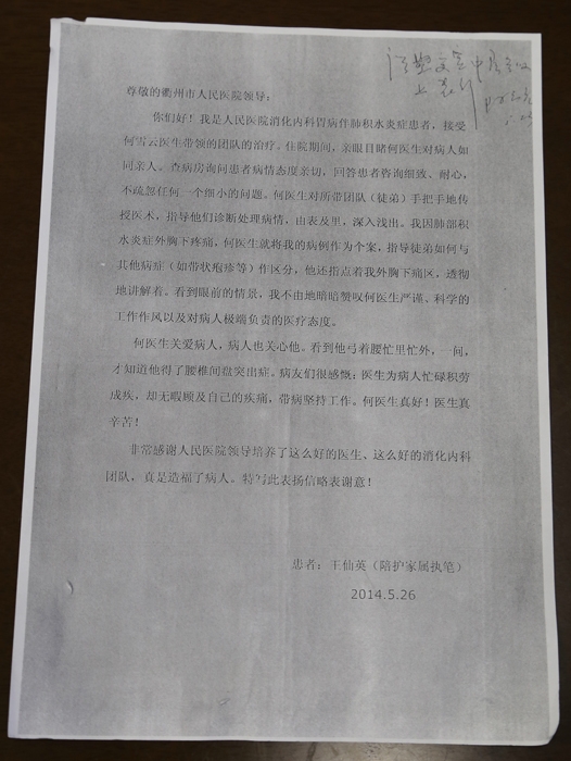 感謝信(致消化內(nèi)科何雪云醫(yī)師)
