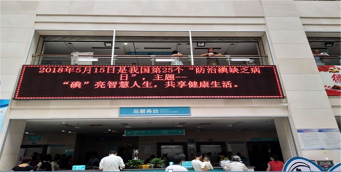 ??? 2018年5月15號(hào)是我國(guó)第25個(gè)“防治碘缺乏病日”,今年的主題是“碘亮智慧人生,共享健康生活”。我院防保處積極響應(yīng)并開(kāi)展碘缺乏病防治日主題宣傳活動(dòng),在宣傳欄擺放 “預(yù)防碘缺乏病”宣傳折頁(yè),在門(mén)診大廳的LED屏上滾動(dòng)播放、宣傳碘缺乏病防治主題。