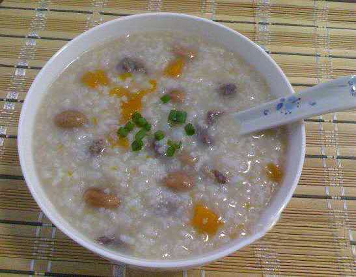 原料:水發(fā)大米75克,牛肉25克,花生米20克,姜片、蔥花各少許。