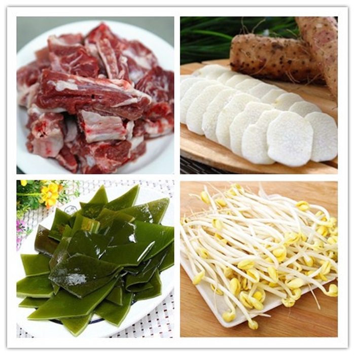 原料:黃豆芽100克、海帶50克、小排骨100克、山藥100克、青椒50克,植物油、鹽、料酒適量