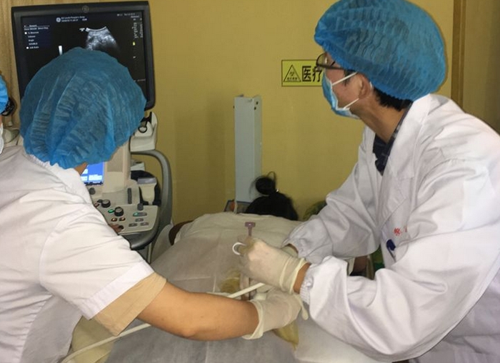 ??? 腎內(nèi)科吳金土主任醫(yī)師在當(dāng)?shù)亻_展了首例長期血透導(dǎo)管置管術(shù),并在和我院B超室邱俊芬醫(yī)師的配合下,在六枝特區(qū)人民醫(yī)院腎內(nèi)科及B超室共同完成了該院第一例腎穿刺術(shù)。術(shù)中、術(shù)后的注意事項(xiàng)及操作要點(diǎn),吳金土主任均親自教授,整個(gè)穿刺過程進(jìn)行得非常順利。