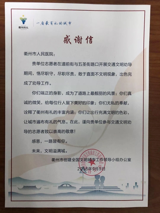 【創(chuàng)文進(jìn)行時(shí)】市創(chuàng)建辦為“有禮”的衢醫(yī)人送來(lái)感謝信