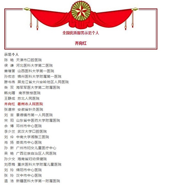 我院榮獲全國優(yōu)質(zhì)醫(yī)療服務(wù)示范醫(yī)院,齊向紅榮獲全國優(yōu)質(zhì)醫(yī)療服務(wù)示范個人