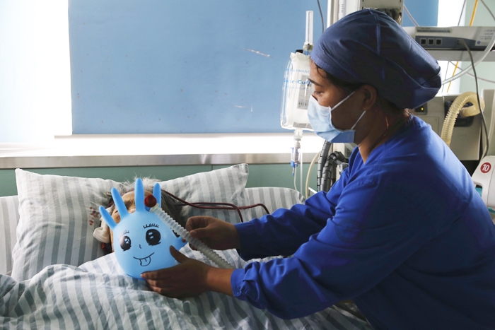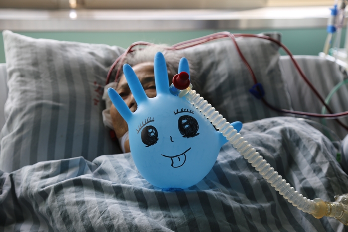 ??? ??? 在我院ICU(重癥監(jiān)護(hù)室)的病床上,可以看到一個個神奇的“五指精靈”,它是由美小護(hù)們用橡膠手套變出來的。