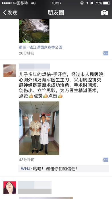 ??? 我院心胸外科萬海軍副主任醫(yī)師僅在患者一側(cè)胸壁切開一個0.5公分左右的小口,在非氣管插管麻醉下行“胸腔鏡雙側(cè)胸交感神經(jīng)切斷術(shù)”,困擾了小王10多年的手汗癥煩惱,竟然十幾分鐘就輕松搞定,效果立竿見影。術(shù)后,小王的手汗癥狀立即消失,雙手轉(zhuǎn)為干燥溫暖狀態(tài),第二天就康復出院了。