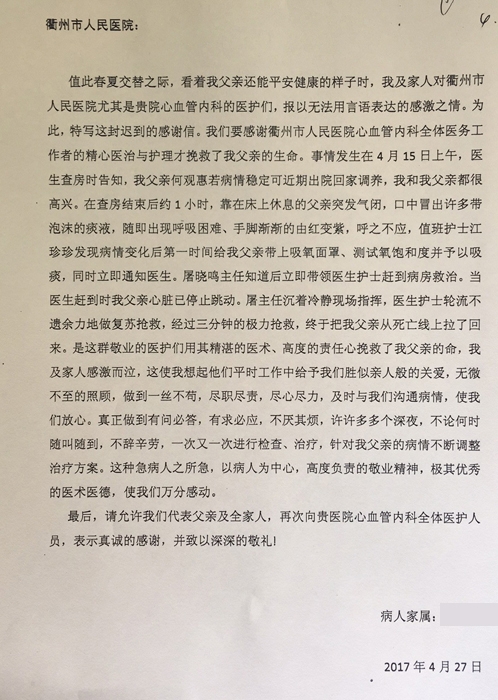 ??? 這是患者家屬寫來(lái)的一封感謝信,雖然信中描述的情景在醫(yī)院里司空見慣,但患者家屬親眼所見、親身經(jīng)歷搶救過(guò)程,忍不住將內(nèi)心的起伏和感激凝于筆端,字里行間情深意切,感情真摯,發(fā)自肺腑!