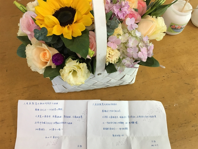 ??? 12月29日一大早,衢州市人民醫(yī)院腎內(nèi)科醫(yī)生李玉芳剛來到辦公室,就覺得眼前一亮:一籃子色彩清新的鮮花、兩封字跡娟秀的感謝信,讓這個寒日有了一絲春天的氣息。