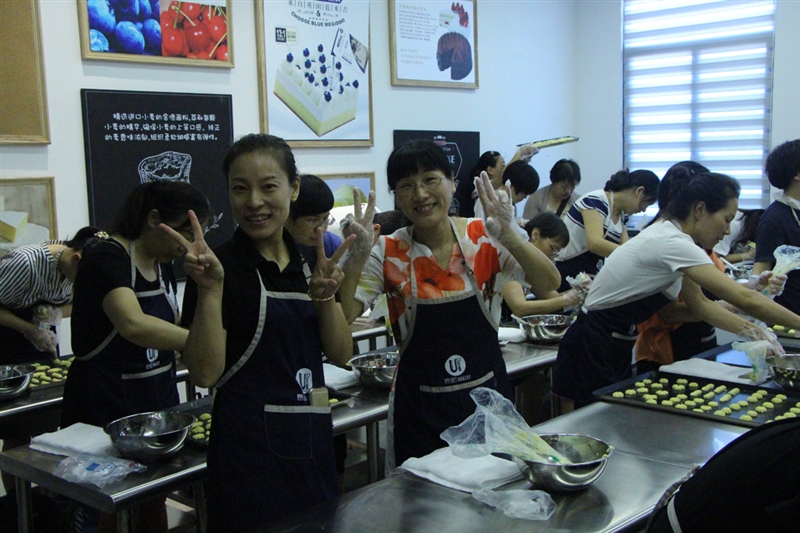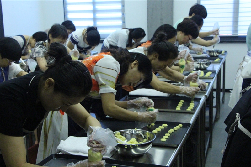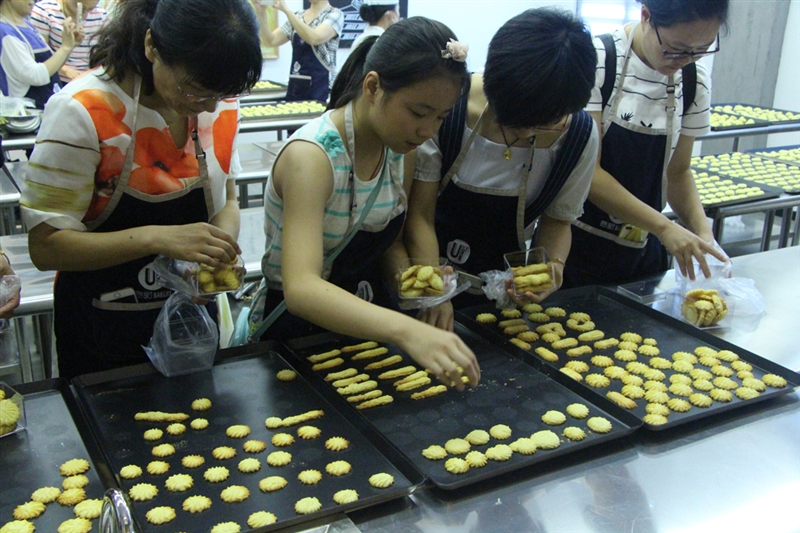 ??? 進(jìn)入操作間,學(xué)員們已經(jīng)整整齊齊地排列在操作崗位上。三十余名同學(xué)圍著圍裙,雙手戴著一次性手套,按照師傅的要求,把調(diào)好的蛋糊裝入裱花袋中,在烤盤里擠出來均勻的形狀,有一字型的,有圈圏的,有梅花狀的,各種各樣的花式,美不勝收。