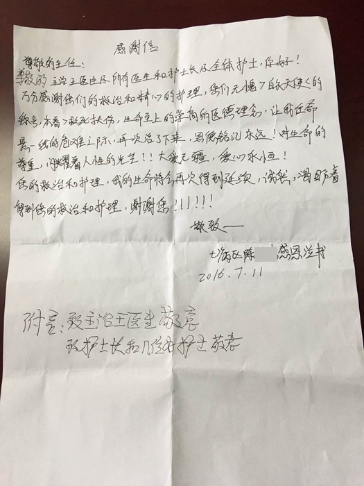??? 6月25日晚上,小陳因從高處墜落傷導(dǎo)致頸椎、胸椎、腰椎多處骨折,由下級醫(yī)院轉(zhuǎn)入我院骨科治療。轉(zhuǎn)入時患者雙乳頭平面以下感覺消失,雙下肢全癱,雙小腿及尾骶部多處二期壓瘡帶入。入院后雙下肢血管彩超提示:雙側(cè)股淺動脈、腘動脈微小斑塊形成,左側(cè)股總靜脈、股深靜脈、股淺靜脈、腘靜脈、脛后靜脈血栓形成。請血管外科、ICU會診后當(dāng)晚,小陳立即在局麻下行經(jīng)皮靜脈內(nèi)濾網(wǎng)置入術(shù),及時有效避免了深靜脈血栓的發(fā)生。在醫(yī)護(hù)人員精心治療下,小陳病情得到控制。因為小陳是外地人,家庭情況特殊,家屬不能及時在院陪護(hù),護(hù)士們平日給予治療的同時,還給予細(xì)心的生活護(hù)理,小陳雙小腿及尾骶部壓瘡明顯好轉(zhuǎn)。因疾病帶給他很大的心理負(fù)擔(dān),讓他失去了對生活的信心,產(chǎn)生了沮喪、不安、消極的情緒,護(hù)士們及時給予小陳心理護(hù)理,關(guān)心和安慰患者,用自己的愛心和細(xì)心感動著小陳。因小陳雙乳頭平面以下全部癱瘓,只有雙手可以活動,所以用雙手寫下了這封感謝信。