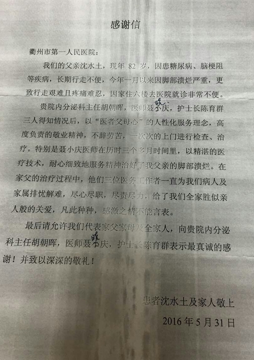 ??? “醫(yī)者父母心,市人民醫(yī)院內分泌科胡朝暉主任,聶曉慶醫(yī)師和陳育群護士長不辭辛勞義務上門服務,我們沒別的方式感謝,只想對他們說聲謝謝!”近日,沈大爺?shù)呐畠禾氐亟o醫(yī)院送來了一封感謝信。