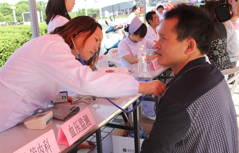 ??? 5月12日下午14:00,衢州市護理學會組織衢州市人民醫(yī)院、衢州市中醫(yī)院、衢州市第三醫(yī)院、衢州市婦保醫(yī)院的25名醫(yī)護人員在火車站廣場進行“健康中國 科普助力”的義診活動?;顒蝇F(xiàn)場的醫(yī)務(wù)人員分為母嬰保健組、慢病宣傳組、急救知識普及組及中醫(yī)康復護理組等,根據(jù)各自的專業(yè)知識進行義診及科普知識宣傳。
