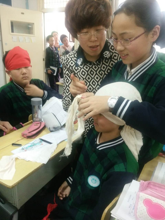 ??? 4月22日下午,愛心志愿者們來到華茂外國語學校七(2)班,利用一節(jié)課的時間讓同學們掌握了外傷包扎的要點與注意事項;通過視頻和現(xiàn)場示范指導,讓同學們學會了打平結和三角巾頭部帽式包扎法。同學們看著自己像變魔術般地將 “死結”樣的繩結輕松地一抽就打開,激動地大叫“我終于學會了”、“太神奇了”。