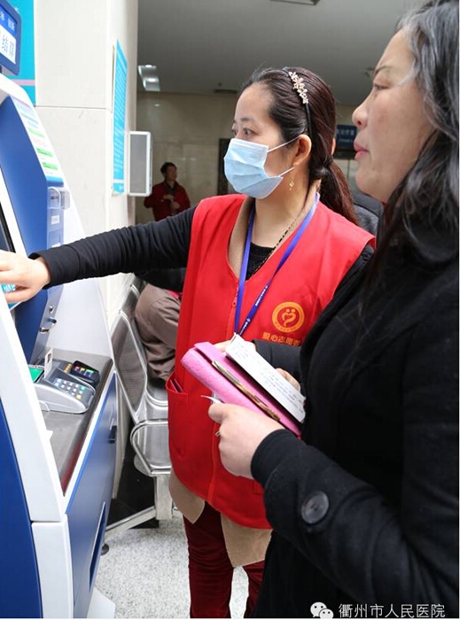 ??? “其實大家排隊都挺自覺的,排亂了我才去引導(dǎo)下?!睏罱ㄇ偈且幻诵莨珓?wù)員,也是衢州市人民醫(yī)院的志愿者。除了幫忙維護(hù)秩序,她還替有需要的病人操作自助服務(wù)機(jī),在機(jī)器上直接完成取號、付款、打印報告等流程。每天有十幾位像她這樣的“紅馬甲”,活躍在醫(yī)院的各個樓層。