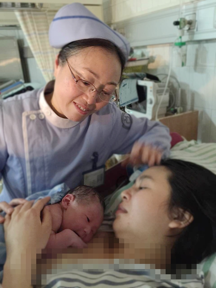 ??? 16時(shí)05分,隨著一聲響亮的啼哭,一個(gè)六斤八兩的健康男嬰誕生了。導(dǎo)樂師將寶寶趴在媽媽的胸前,他,柔柔地伏臥著,靜靜地感受著媽媽的心跳和溫度。媽媽用慈愛的目光凝視著寶寶,母子倆沉浸在早接觸所帶來的喜悅之中。