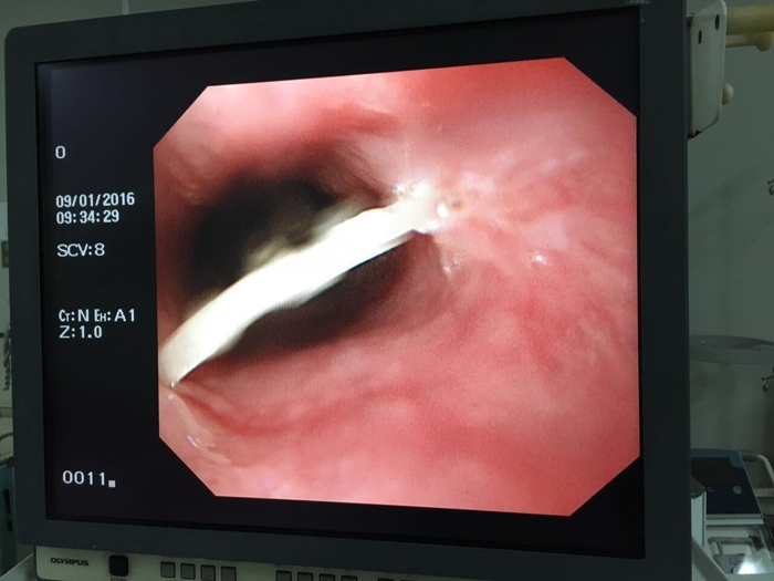 ??? 據(jù)消化內(nèi)鏡中心葉泉忠醫(yī)生介紹,這種情況下,任何輕微的外力刺激,都可能使魚刺刺穿血管導(dǎo)致大出血,患者可能隨時猝死。即使這類險情不發(fā)生,因食管已被刺破,引發(fā)感染后病死率也很高。病情險急,需立即取出魚刺。但因距離患者晚餐后時間太短,擔(dān)心術(shù)中全麻誤吸造成窒息,所以醫(yī)護人員密切監(jiān)護患者的病情變化。次日晨,葉泉忠醫(yī)生在手術(shù)室為徐先生做了無痛內(nèi)鏡下食管異物取出術(shù),取出了一枚2.5cm長的魚刺。