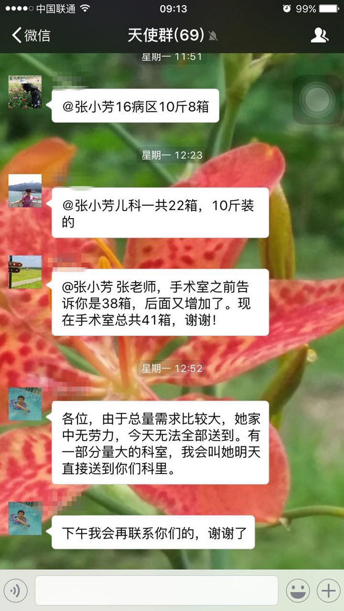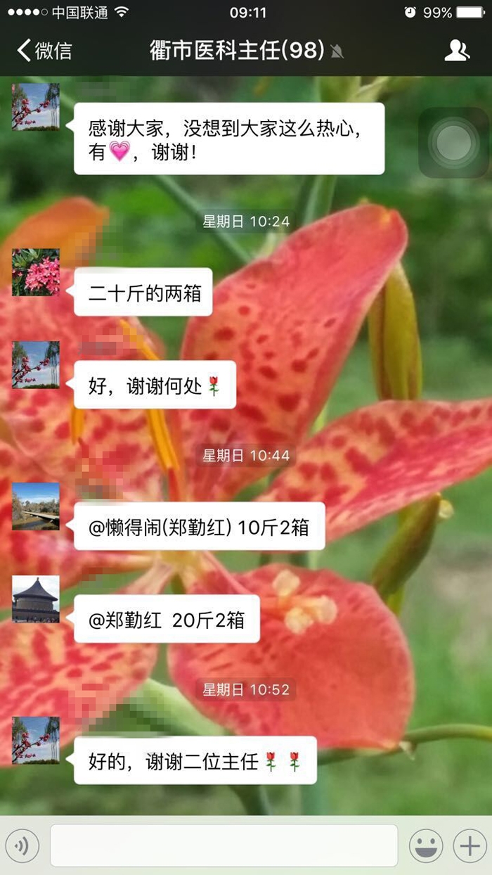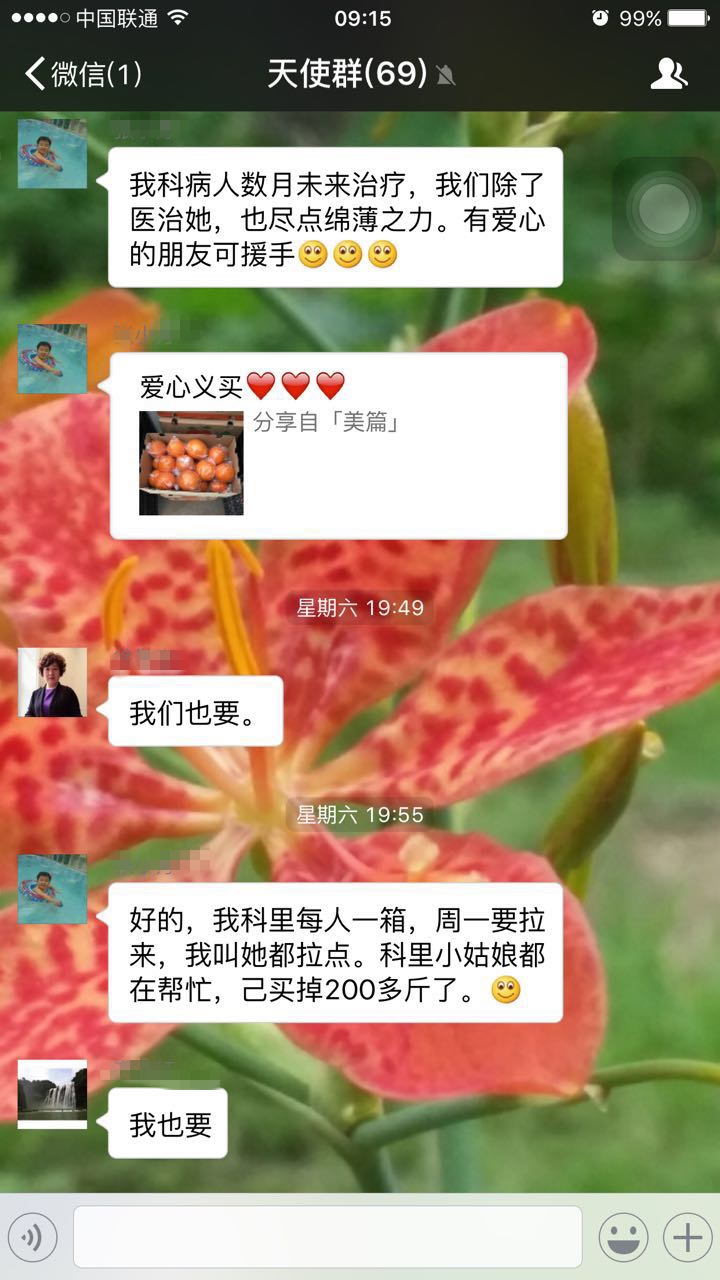 ??? 鄭勤紅一直關(guān)注著這個(gè)多難的家庭,得知此事后立即通過微信向院內(nèi)的醫(yī)護(hù)人員發(fā)出求助信息,消息一經(jīng)發(fā)出,院內(nèi)的醫(yī)務(wù)人員紛紛向謝冬蓮伸出援手,經(jīng)過的路人、看病的患者見此情景也紛紛鼎力相助,十箱、二十箱……目前,我院的醫(yī)務(wù)人員已經(jīng)幫助謝冬蓮售出600多箱臍橙,為謝冬蓮籌集資金四萬余元。