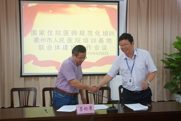 ??????? 陳震宏院長分別與6家醫(yī)院的院長簽訂了《衢州市人民醫(yī)院規(guī)培基地聯(lián)合體協(xié)議書》,對(duì)我院和協(xié)同基地醫(yī)院間的義務(wù)和責(zé)任進(jìn)行了規(guī)定。