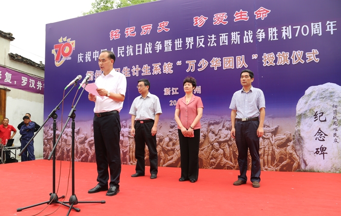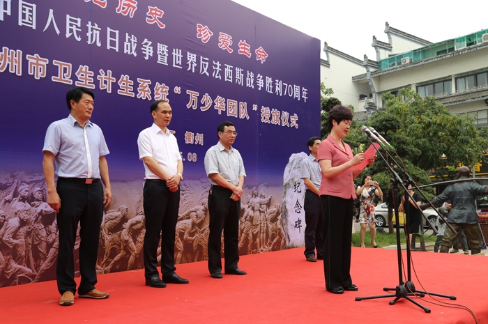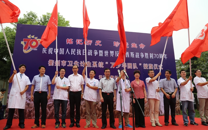 今年是中國人民抗日戰(zhàn)爭暨世界反法西斯戰(zhàn)爭勝利70周年,為了銘記歷史,大力弘揚“救死扶傷、關(guān)愛生命、無私奉獻(xiàn)”的衛(wèi)生計生職業(yè)精神,8月28日上午,衢州市衛(wèi)生計生委在市區(qū)羅漢井細(xì)菌戰(zhàn)衢州展覽館前廣場舉辦“萬少華團隊”授旗儀式。省衛(wèi)生計生委巡視員葉真,宣傳處處長徐兆禮,市委常委、宣傳部長諸葛慧艷,市衛(wèi)生計生委主任陳根成等出席活動。副市長陳錦標(biāo)主持授旗儀式,全市150余名醫(yī)護人員參加儀式。