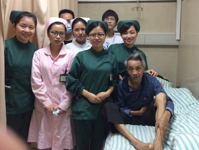 經(jīng)過醫(yī)護(hù)人員1個小時(shí)有條不紊的搶救,明確了診斷,控制了病情,急診科的護(hù)士們知道,真正考驗(yàn)她們的時(shí)候到了。距離護(hù)士站最近的一張床位留給了這位特殊的患者。每個人都主動承擔(dān)起照顧老人的工作,每天上班第一件事就是幫忙整理床位,擦身更衣,輪流照顧他喂飯、喝水、大小便、翻身、拍背,只要一有空大家就會朝那個固定的方向望上兩眼。時(shí)間一天天過去,那個固定的方向,那張熟悉的臉龐,已經(jīng)深深印在急診科每個護(hù)士的心里。除了精心治療與護(hù)理外,她們更給予老人親人般的溫暖,老人每天都能聽到關(guān)懷和鼓勵的親切話語。那位好心的朋友也=每天過來陪他聊聊天,他也從最初口齒不清的發(fā)音到慢慢地能和大家交流了。整整31天的朝夕相處,急診科20多名護(hù)士的悉心照料,老人的身體狀況逐漸恢復(fù)。