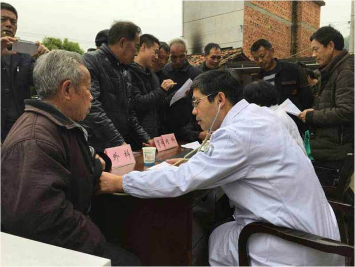 ??? 在楓林村委會門口,中醫(yī)、內(nèi)科、外科、婦科、兒科、口腔科、疼痛科等11位專家剛落座,一大早就等候著的村民們便圍了上來。專家們?yōu)槿罕娒赓M測量血壓,B超檢查,解析病情,提出治療意見,中醫(yī)把脈開方,并在飲食、季節(jié)變化等方面向村民介紹防病治病的具體措施,以提高自我防護和保健水平。