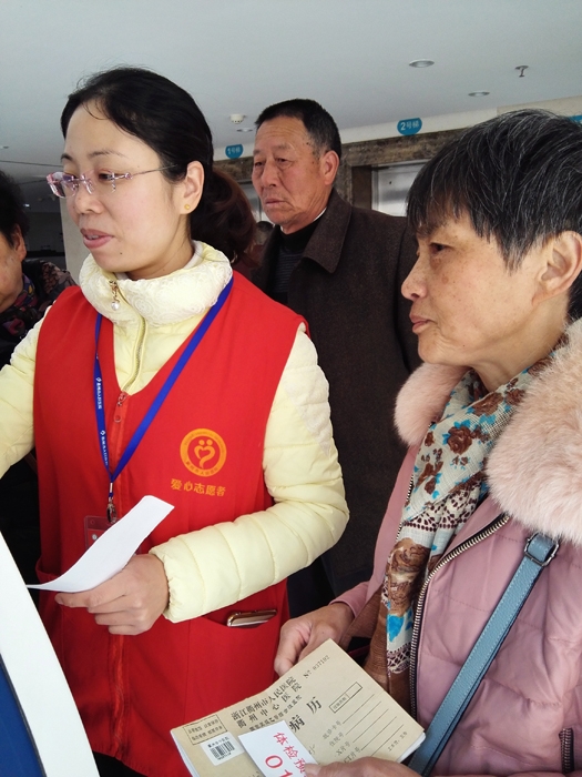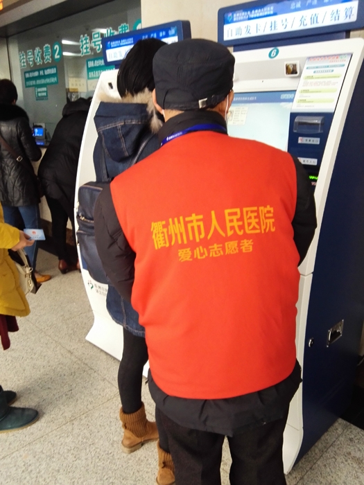 ??? 葉時輯、汪益珠、楊美姣、朱愛英、劉雪珍、方月升、胡曉芬、徐國良、汪錫耀、林涵穎、張峰、夢萍、劉瑩、錢帥、徐雪梅等15人在衢州市人民醫(yī)院做志愿者,主要來自社會志愿者和本院志愿者。 志愿者們主要為患者指路引導(dǎo),陪伴行動不便、年老體弱患者就診,指導(dǎo)患者自助服務(wù)機(jī)使用方法,引導(dǎo)患者化驗(yàn)前取號、打印化驗(yàn)單,協(xié)助門診大廳工作人員疏導(dǎo)病人。