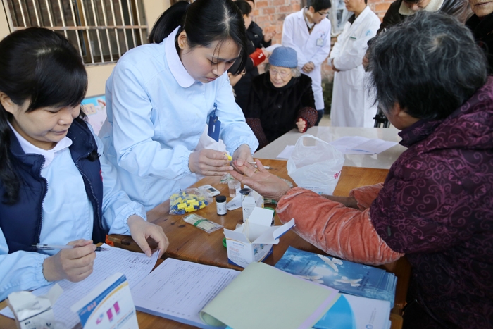 ??? 醫(yī)護(hù)人員向糖尿病患者做《糖尿病飲食治療》、《糖尿病運(yùn)動治療》的健康知識講座,分發(fā)健康宣教資料并進(jìn)行免費(fèi)血糖和血脂監(jiān)測。