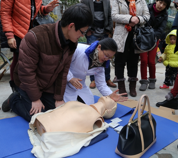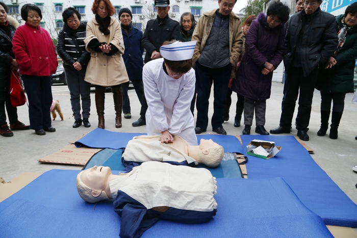??? 急危重病學(xué)中心護(hù)士長邵微穎運(yùn)用扎實(shí)的理論知識(shí),結(jié)合精彩的PPt圖片,用通俗易懂的語言講授了心肺復(fù)蘇的理論知識(shí),著重介紹了如何避免擁擠處踩踏事件的發(fā)生以及發(fā)生意外事件時(shí)的自救方法。此外,還進(jìn)行了室外模擬演練和心肺復(fù)蘇演示。社區(qū)的黨員干部分2組進(jìn)行練習(xí),現(xiàn)場(chǎng)氣氛相當(dāng)活躍。