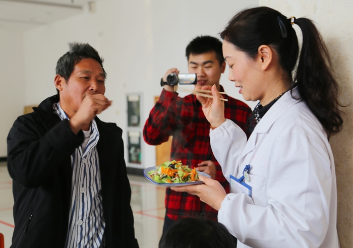 ??? 活動(dòng)邀請(qǐng)了市疾控中心方春福主任作知識(shí)講座,講解了糖尿病的高發(fā)流行現(xiàn)狀以及積極防治的重要性。我院營(yíng)養(yǎng)科主任毛春英為患者講授了正確進(jìn)行食物選擇的方法,以及如何進(jìn)行營(yíng)養(yǎng)配餐。為了讓患者掌握營(yíng)養(yǎng)餐的制作過程,營(yíng)養(yǎng)科廚師現(xiàn)場(chǎng)進(jìn)行了烹調(diào)展示,講解了炒菜時(shí)添加油、鹽和利用量和方法。隨后大家興致勃勃地品嘗了合理用料菜品的味道,提高了糖尿病患者在飲食方面的知識(shí)水平和實(shí)踐操作能力。