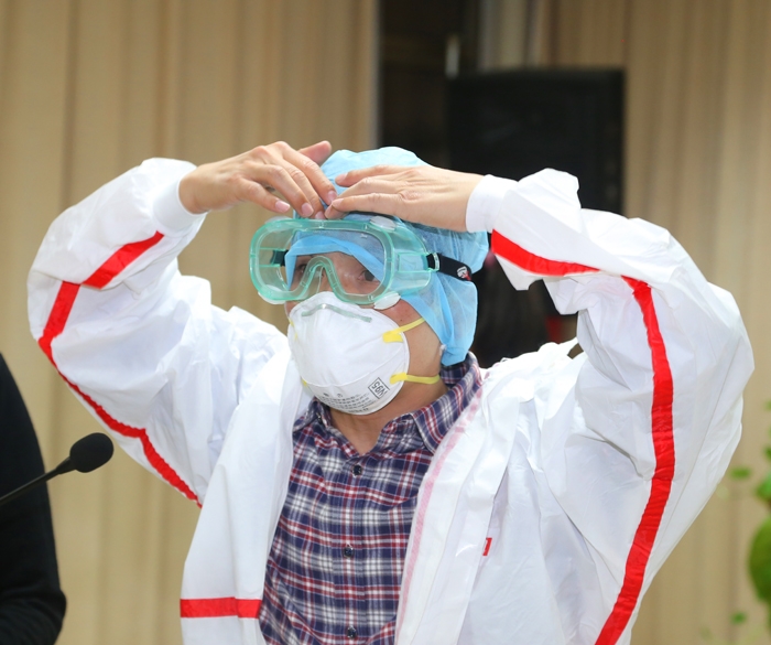 感染科盧偉力副主任演示如何正確佩戴N95口罩及防護(hù)手套、正確穿脫連體防護(hù)服等