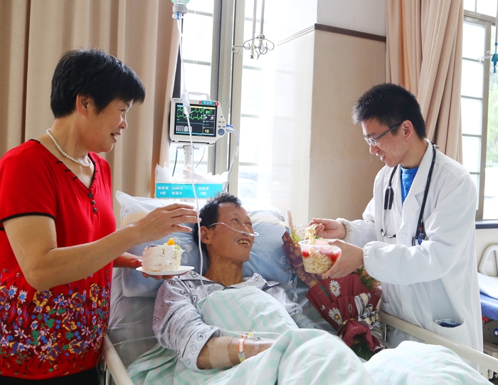 ??? 10月20日,對于躺在急診病房病床上的陳濤(化名)來說,是難忘的一天?!白D闵湛鞓贰⒆D闵湛鞓贰?,當醫(yī)護人員推著小車,唱著生日歌把蛋糕和面條擺在他面前時,他激動地眼眶都濕潤了,一直說到:“沒想到醫(yī)生護士會記得我的生日,謝謝!謝謝!你們不僅救我的命,還給我過生日,我不知道要怎么感謝你們!”這簡單、樸實的話語讓在場的人都備受感動。