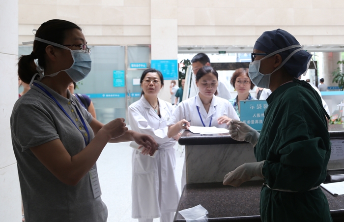 ??? 演練模擬一名從“利比亞疫區(qū)務(wù)工回國人員”,出現(xiàn)了腹瀉、腹痛、惡心、嘔吐、發(fā)燒等癥狀,疑似埃博拉病毒感染,到我院診治的場景。演練考核了醫(yī)護(hù)人員的防護(hù)穿戴、預(yù)檢分診、標(biāo)本采集接送、專家會(huì)診、病人轉(zhuǎn)院、現(xiàn)場消毒、應(yīng)急響應(yīng)等一系列流程,生動(dòng)、直觀地展現(xiàn)了防控疫情的全過程。