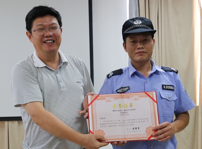 ??? 9月2日,醫(yī)院在院周會(huì)上表彰見義勇為、不顧自身安危的保安汪美紅,由院長陳震宏對(duì)汪美紅發(fā)布嘉獎(jiǎng)令,授予汪美紅“見義勇為”獎(jiǎng)。