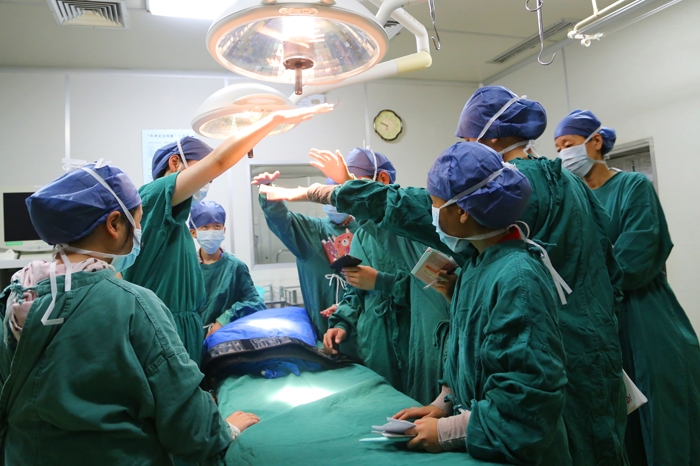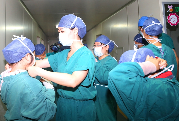 ??? 第二站,手術(shù)室。在小記者們感到神秘而有趣的手術(shù)室里,他們在手術(shù)室護(hù)士長盛莉的指導(dǎo)下穿上手術(shù)衣,戴上帽子和口罩,全副武裝后儼然是一個個小“白衣天使”了。護(hù)士長帶領(lǐng)大家參觀了手術(shù)床、手術(shù)器械和各種先進(jìn)的診療設(shè)備、儀器,并指導(dǎo)正確的六步洗手法和外科洗手法。一會兒,小朋友們紛紛表示口罩帶著很悶,不舒服。當(dāng)聽護(hù)士長說醫(yī)護(hù)人員在手術(shù)室工作時要一直帶著口罩,甚至在碰到大手術(shù)的時候要不吃不喝站上7、8個小時,期間為了不上廁所,在手術(shù)開始前就不敢多喝水,他們驚訝地說:“做手術(shù)的叔叔、阿姨真不容易!太辛苦了!”