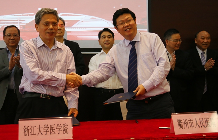 浙江大學(xué)醫(yī)學(xué)院院長段樹民院士與我院院長陳震宏(圖右)簽訂《院校醫(yī)學(xué)合作項(xiàng)目備忘錄》