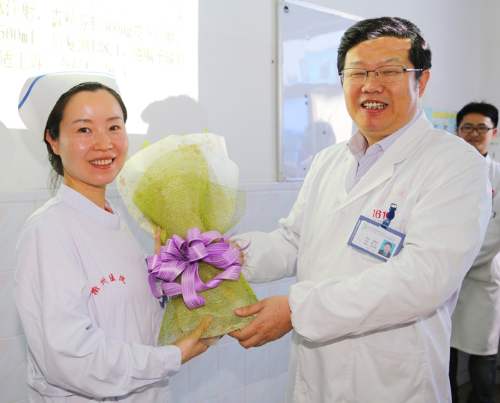??? 同時,我院院長陳震宏、黨委書記徐天才、副院長周見、院長助理廖小方在護理部主任的陪同下,代表醫(yī)院領(lǐng)導班子看望并慰問了在崗的護士姐妹們,向她們道一聲“節(jié)日快樂!