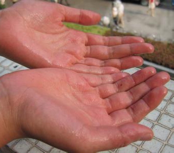 ??? 手汗癥是指正常生活環(huán)境和條件下雙手異常多汗,主要表現(xiàn)為手掌總是濕漉漉的,甚至如出水狀?;颊呤植咳菀酌撈?,有礙觀瞻,顏面潮紅,足底、腋下多汗,炎熱、情緒緊張時(shí)可加重。大多是交感神經(jīng)過度興奮引起的,另外,部分甲狀腺功能亢進(jìn)、糖尿病及精神障礙等系統(tǒng)性疾病患者會發(fā)生繼發(fā)性手汗癥,手汗癥患者以原發(fā)多見。男女都可發(fā)病,多見兒童期,有家族遺傳性,青春期時(shí)癥狀明顯。部分患者伴有足底、腋下多汗。