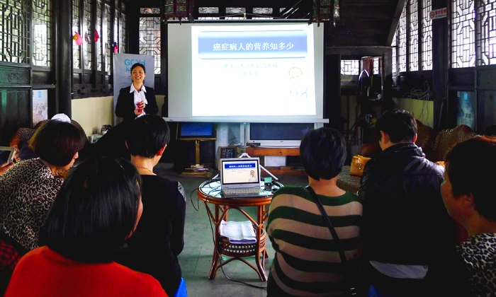 ??? 4月16日下午,在南湖西公園湖心亭癌癥康復俱樂部活動中心,我院營養(yǎng)科主任毛春英應邀作《癌癥與營養(yǎng)》專題講課,60多位癌癥會員參加聽課。