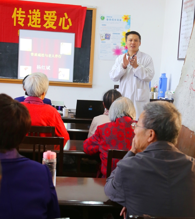 ??? 據(jù)了解,為提高廣大民眾對骨質(zhì)疏松癥的認(rèn)識,進一步地宣傳防治骨質(zhì)疏松的重要性,內(nèi)分泌科全體醫(yī)生與護士一起組成骨質(zhì)疏松宣教隊,2014年度每月進社區(qū)、下基層,開展“關(guān)注健康 傳遞愛心”義診活動,為廣大群眾進行骨質(zhì)疏松癥與糖尿病的宣教,免費提供血糖、血壓測定以及超聲骨密度檢查。