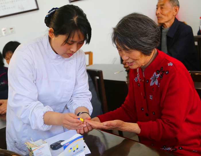 ??? 現(xiàn)場還免費為老年朋友提供骨密度測定、測血糖、量血壓,吸引了近70余名老人參加。