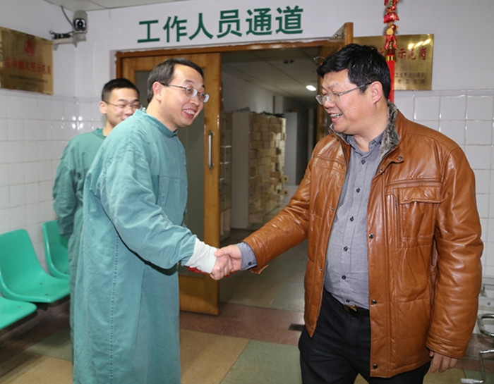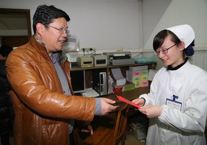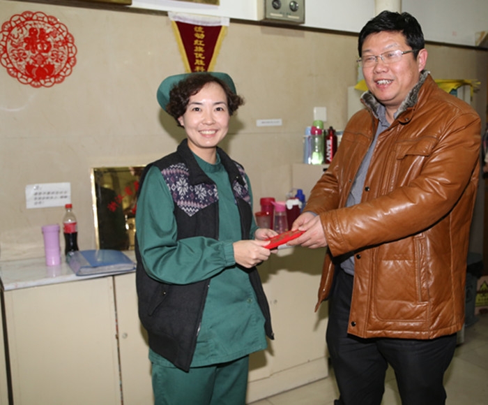 ????? 除夕夜晚7時,院長陳震宏、黨委書記徐天才率副院長周見、副院長王巨宏及相關(guān)職能部門負責(zé)人深入各臨床住院病區(qū)、急診、醫(yī)技科室、藥房、后勤保衛(wèi)等部門,向春節(jié)期間仍堅守崗位的一線職工致以最誠摯的節(jié)日問候和新春祝福。?