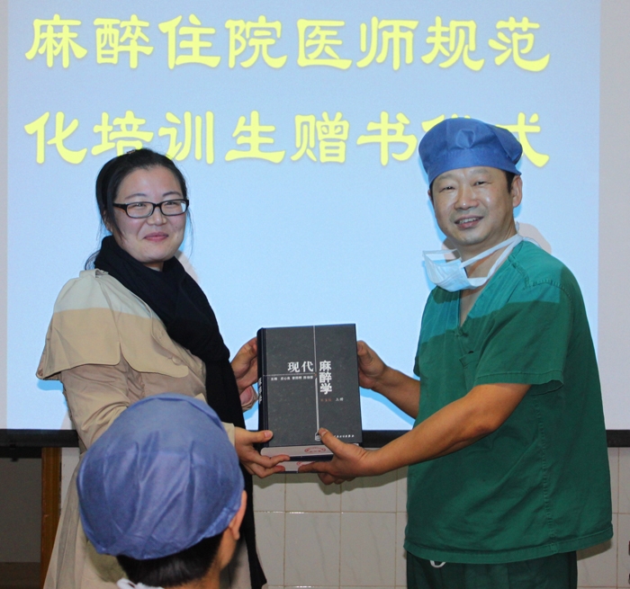 ??? 近日,我院麻醉科在每周例行的小講課上,舉行了住院醫(yī)師規(guī)范化培訓生贈書儀式。向來自本市各兄弟醫(yī)院及貴州六枝特區(qū)人民醫(yī)院共6名青年醫(yī)師捐贈了《現(xiàn)代麻醉學》(上、下冊)一套,并在書的扉頁附上了麻醉科全體帶教老師的簽名。